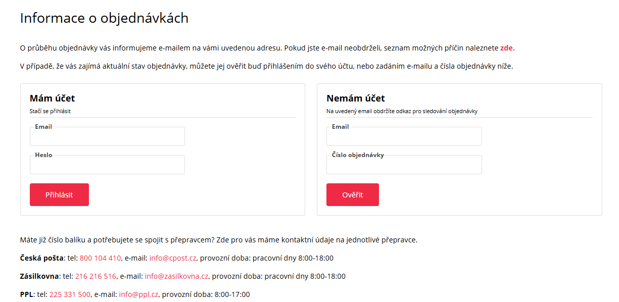 Sledování objednávky je možné několika způsoby. Ve spodní části webu najdete v sekci “Informace pro vás” řádek “Sledování objednávky”. Po jejím rozkliknutí se vám zobrazí tabulka.