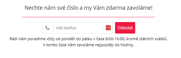 Zde stačí pouze kliknout na “Zavolejte mi” a po zobrazení tabulky vyplníte telefonní číslo a potvrdíte tlačítkem “Odeslat”.