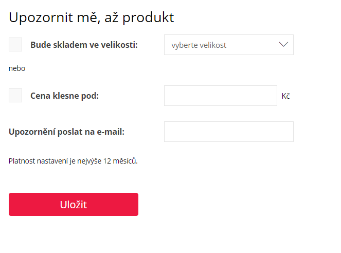 Nebo si můžete nastavit hlídacího psa nejen na sledování konkrétního produktu a jeho velikosti, ale také na sledování poklesu ceny na vámi zadanou částku. Jakmile hlídacího psa nastavíte, na uvedený e-mail vám zašleme notifikaci ihned, jakmile velikost opět doskladníme, nebo cena produktu klesne na vámi zadanou částku.