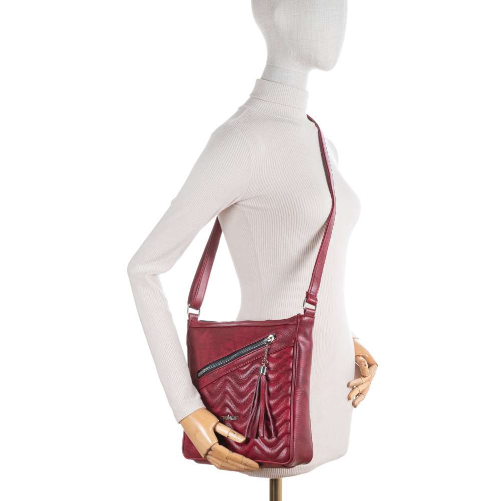 Detailní informace Kabelka RIEKER je skutečným mistrovským kouskem, který spojuje moderní design a praktičnost pro každodenní použití. Svršek kabelky je vyhotoven ve výrazné červené barvě, která okamžitě dodává modelu výrazný charakter a prostřednictvím efektních linií prošívání zvýrazní estetiku. Logo značky RIEKER ve stříbrné barvě je umístěno na přední části kabelky a působí decentně, ale zároveň podtrhuje prestiž značky. Přední část kabelky je vybavena praktickou kapsou na zip, která je doplněna dekorativní aplikací – ideální pro rychlé uložení drobností. Zadní strana kabelky obsahuje diskrétní všitou kapsu na zip. Hlavní prostor kabelky je uzavíratelný kvalitním zipem, který zajišťuje bezpečné uložení obsahu a uvnitř se nacházejí dvě menší vnitřní kapsičky, jedna z nich se zipem a druhá je otevřená. Takto členitý prostor umožňuje efektivní organizaci a přehlednost obsahu, což výrazně zvyšuje komfort každodenního používání. Kabelka je vybavena délkově nastavitelným popruhem, který lze snadno přizpůsobit vašim potřebám a můžete ji nosit přes rameno nebo crossbody, přičemž popruh zajišťuje pohodlné nošení i při delším používání. S touto kabelkou RIEKER získáte víc než jen módní doplněk, je to kabelka, která svým zpracováním a designem odráží přesně to, co značka RIEKER představuje – styl bez kompromisů, spolehlivost a důraz na každý detail.