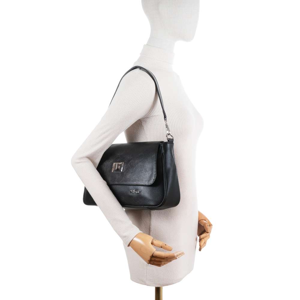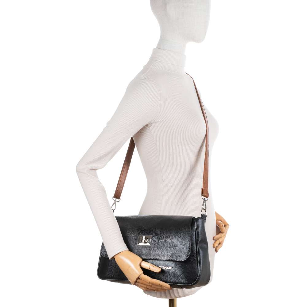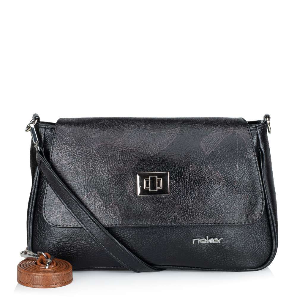 Černá elegance kabelky v módním stylu značky RIEKER osloví každou ženu, černý svršek je ozdoben působivým vzorem květin, který dodává modelu jemný nádech ženskosti a originality. Design doplňuje logo značky ve stříbrné barvě, které podtrhuje elegantní charakter kabelky. Vrchní díl kabelky je vybaven stylovým zapínáním, které elegantně zakrývá hlavní zip – díky tomu kabelka působí uhlazeně a zároveň nabízí praktické a bezpečné uzavření. Po odepnutí se otevře dobře organizovaný vnitřní prostor, který vás překvapí svojí promyšlenou funkčností. Hlavní přihrádka poskytuje dostatek místa pro všechny nezbytnosti každodenního života a naleznete zde otevřenou kapsičku, ideální na drobnosti, které chcete mít vždy po ruce, a uzavíratelnou kapsu na zip, do které můžete bezpečně uložit cennější předměty. Takto máte vše přehledně uspořádané a snadno dostupné. Na zadní straně kabelky se nachází další kapsa se zipem vhodná k uložení drobností, ke kterým potřebujete rychlý přístup bez nutnosti otevírat hlavní prostor. Při nošení oceníte i variabilní možnosti – kabelka je vybavena krátkým pevným popruhem a nastavitelným dlouhým ramenním popruhem v kontrastně hnědé barvě, který lze délkově přizpůsobit a obě varianty jsou odepínatelné. Kabelka RIEKER není jen praktickým doplňkem – je to šperk vašeho outfitu, který podtrhne váš osobní styl. Její vzhled umožňuje kombinování s různými outfity – skvěle vynikne se šaty, ale také s ležérními džínami či kabátem. Tento model nabízí nejen vizuální přitažlivost, ale také praktičnost, což z ní činí perfektní doplněk pro každodenní nošení s nádechem jedinečnosti. Rozměry: cca V 19 cm x Š 31 cm x H 9 cm Vnitřní uspořádání: kabelka není dělená Kabelka má délkově nastavitelný popruh, který lze odepnout. Maximální délka nastavitelného popruhu je cca 125 cm. Délka pevného a odepínatelného popruhu je cca 45 cm.