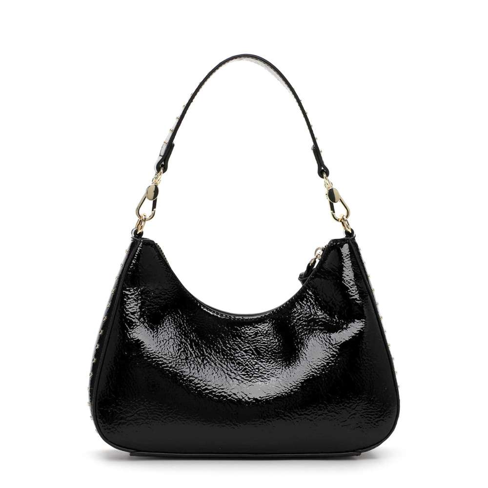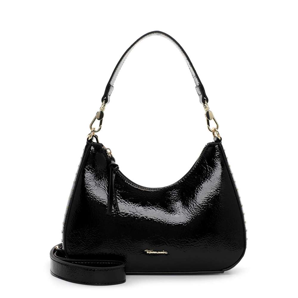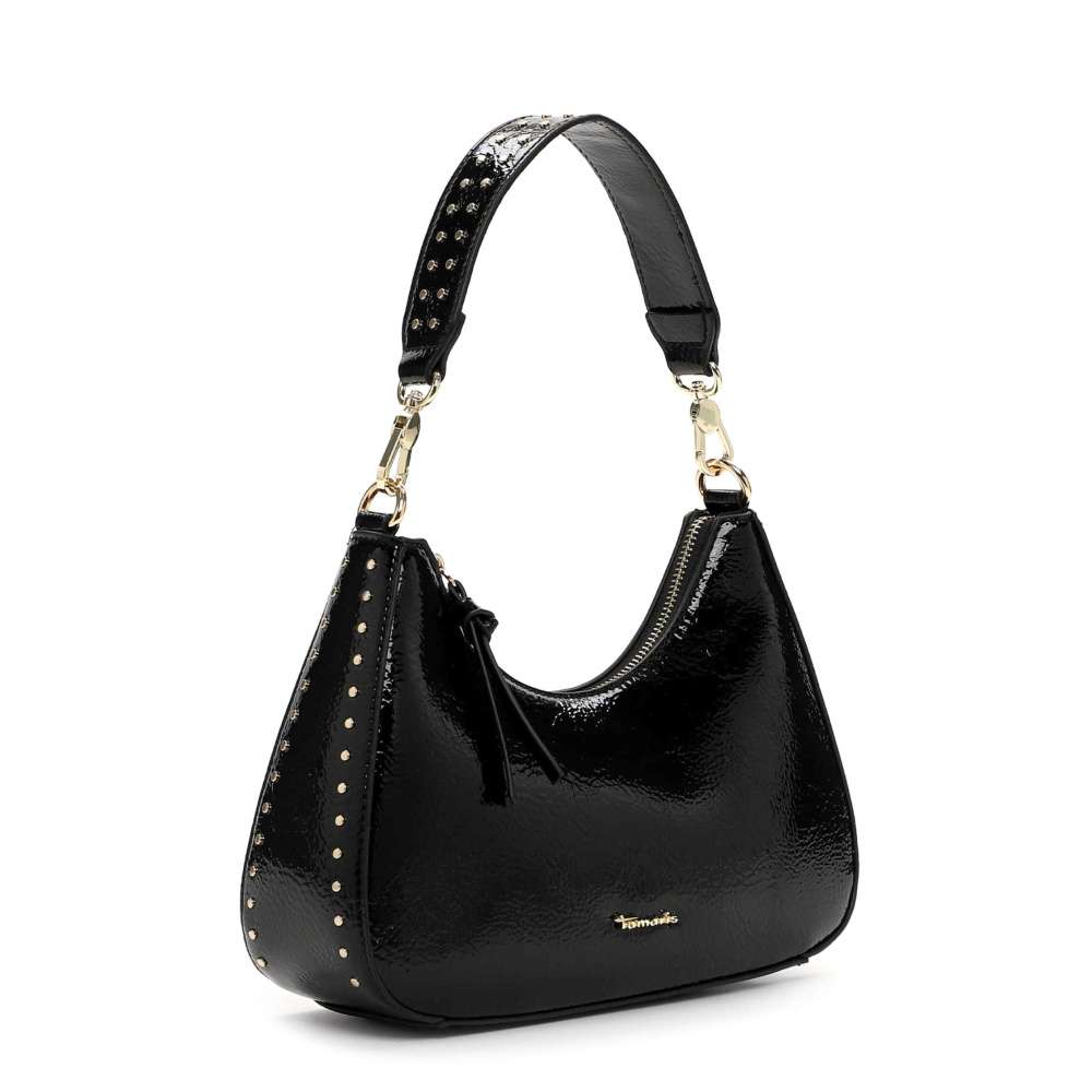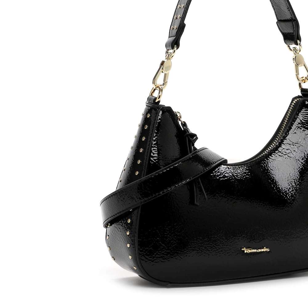 Trendy kabelka Tamaris s výraznými detaily, tuto stylovou kabelku Tamaris rozhodně nelze přehlédnout. Lesklý černý svršek doplňuje zlaté logo značky a poutavé aplikace po stranách, které jí dodávají atraktivní vzhled. Hlavní prostor se uzavírá vrchním zipem a vytváří místo k uložení věcí včetně dvou menších vnitřních kapsiček pro přehledné uložení věcí. Kabelka je vybavena dvěma popruhy – kratší pevný je dekorovaný kulatými prvky a delší nastavitelný popruh umožňuje nošení přes rameno nebo přes tělo, oba popruhy lze odepnout a kabelku snadno přizpůsobíte svým potřebám i stylu. Tato kabelka vytváří skvělý doplněk pro ženy, které chtějí spojit funkčnost s aktuálními módními trendy. Rozměry: cca V 18 cm x Š 26 cm x H 8 cm Vnitřní uspořádání: kabelka není dělená Kabelka má délkově nastavitelný popruh, který lze odepnout.