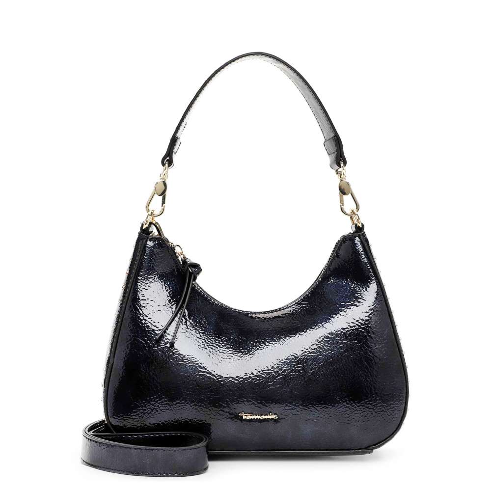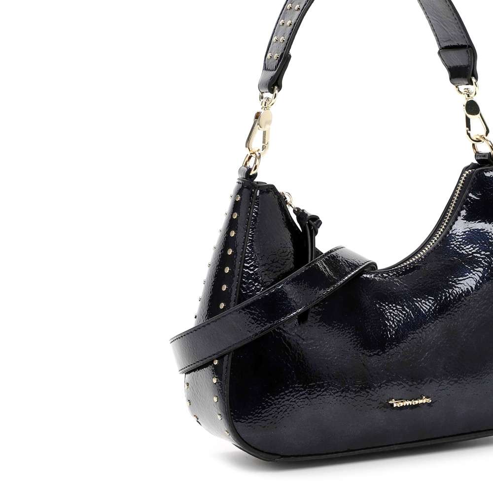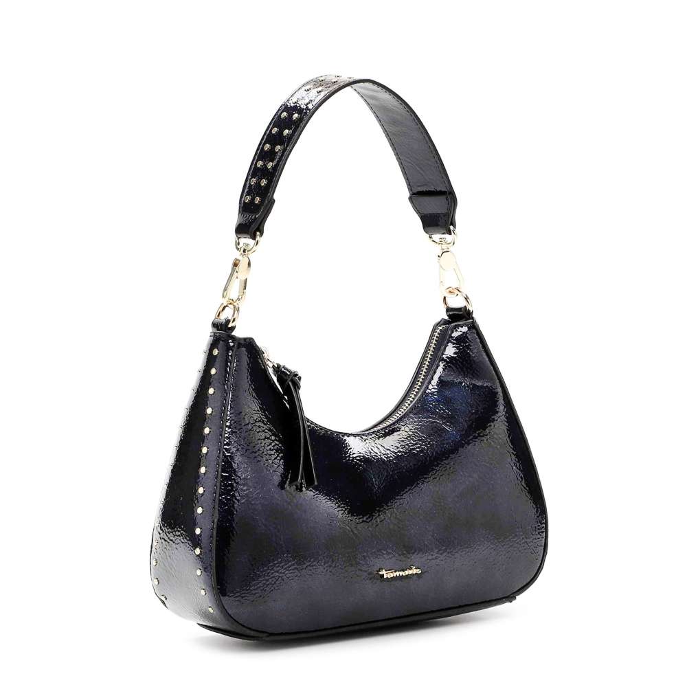 Trendy kabelka Tamaris s výraznými detaily, tuto stylovou kabelku Tamaris rozhodně nelze přehlédnout. Lesklý tmavě modrý svršek doplňuje zlaté logo značky a poutavé aplikace po stranách, které jí dodávají atraktivní vzhled. Hlavní prostor se uzavírá vrchním zipem a vytváří místo k uložení věcí včetně dvou menších vnitřních kapsiček pro přehledné uložení věcí. Kabelka je vybavena dvěma popruhy – kratší pevný je dekorovaný kulatými prvky a delší nastavitelný popruh umožňuje nošení přes rameno nebo přes tělo, oba popruhy lze odepnout a kabelku snadno přizpůsobíte svým potřebám i stylu. Tato kabelka vytváří skvělý doplněk pro ženy, které chtějí spojit funkčnost s aktuálními módními trendy. Rozměry: cca V 18 cm x Š 26 cm x H 8 cm Vnitřní uspořádání: kabelka není dělená Kabelka má délkově nastavitelný popruh, který lze odepnout.