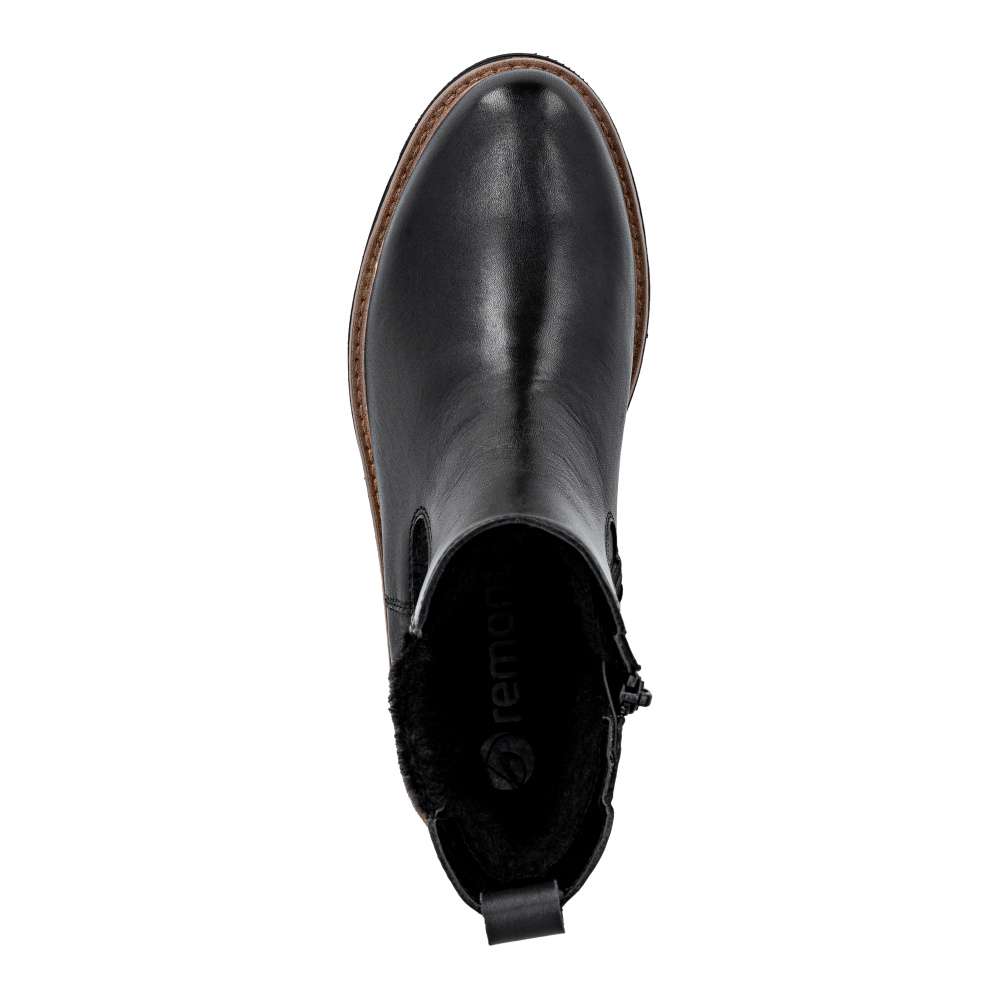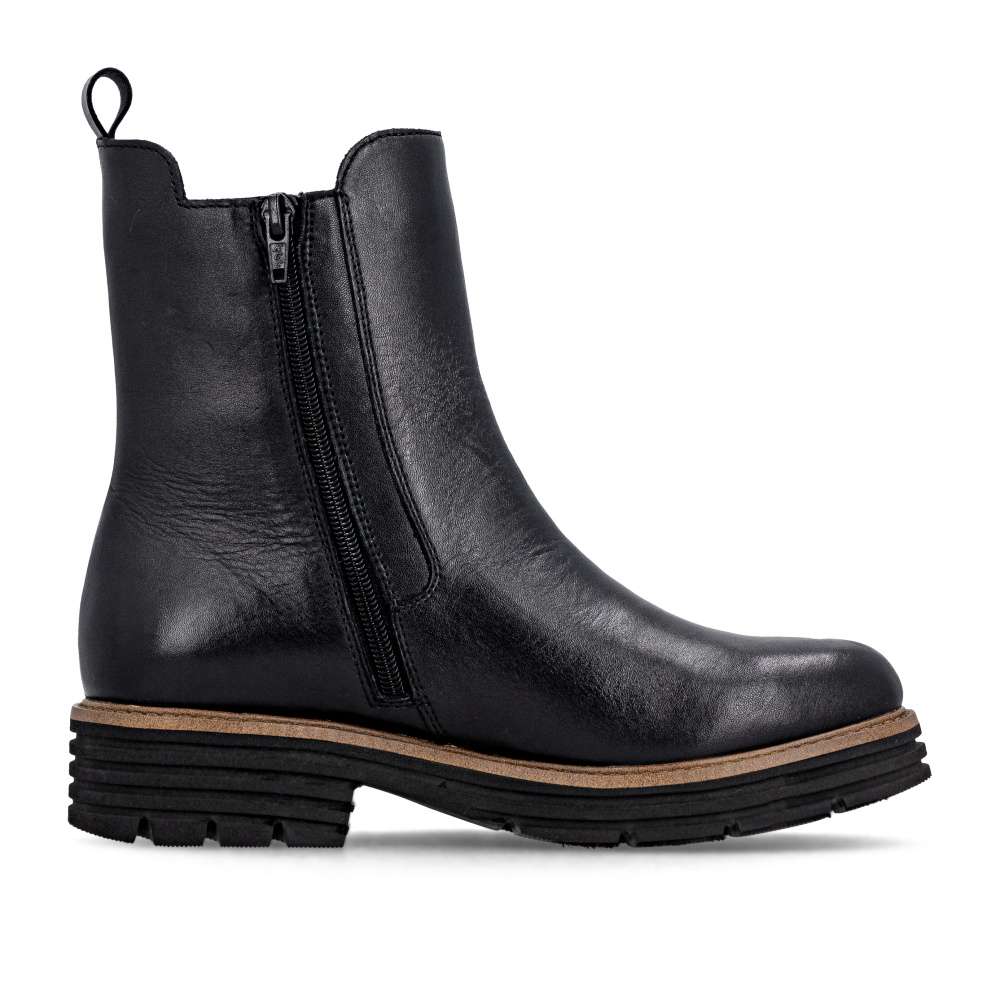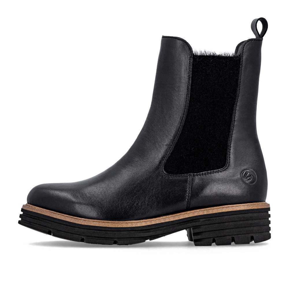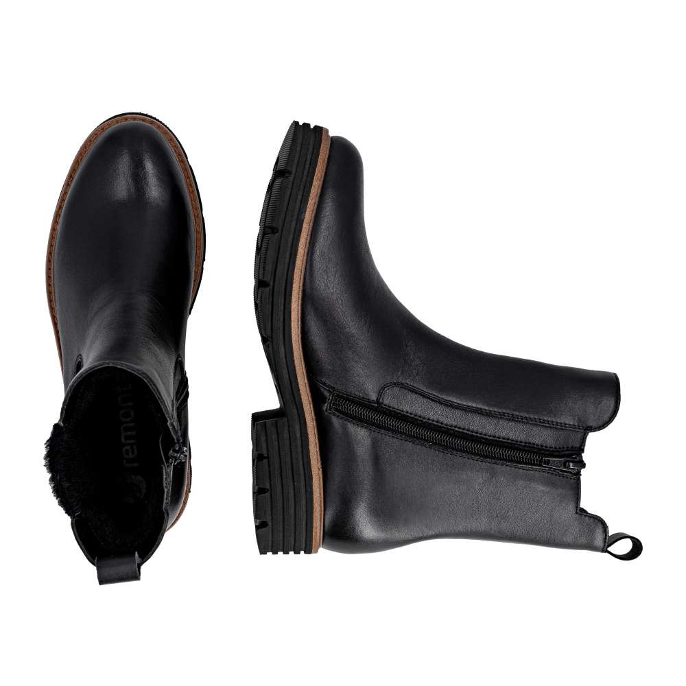 Obuv REMONTE – jedná se o vyšší řadu značky RIEKER, tato obuv se vyznačuje vynikající kombinací svrchních materiálů. Pro každou moderní ženu je tento model od značky RIEKER nezbytností v šatníku. Černý kožený svršek s atraktivním pružným dílem a logem značky představuje spojení módního vzhledu a funkčnosti. Díky zipu umístěnému na vnitřní straně boty je nazouvání jednoduché, nazutí poskytne pohodlí vyjímatelné stélky a zateplení pravou ovčí vlnou poskytující optimální tepelný komfort za každého počasí. Podešev s výrazným vzorem dodává obuvi jedinečný vzhled svým světlým lemem a navíc zajišťuje stabilní krok. Tyto kotníkové boty jsou skvělou volbou pro každodenní nošení a budou dokonalým doplňkem každého outfitu. Technologie: Lite'n Soft - maximální komfort při nošení vytváří kombinace lehké podešve, velmi příjemných materiálů a komfortní stélky. Podšívka je z pravé ovčí vlny. Tato bota je vybavena vyjímatelnou stélkou.