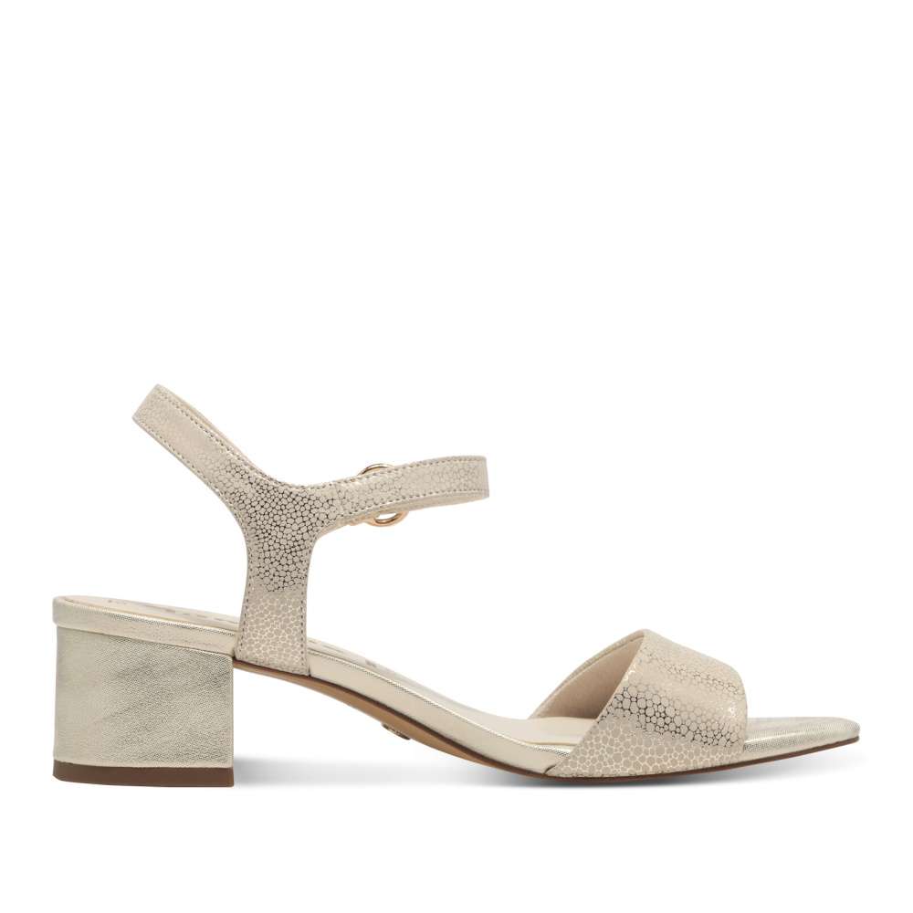 Detailní informace Sandálky značky Tamaris budou stylovým a komfortním doplňkem pro letní sezónu. Kožený svršek s nádhernými odlesky zlaté barvy a jemným vzorem dodá obuvi elegantní vzhled a pásek u kotníku se suchým zipem usnadní obouvání a přizpůsobení se přímo Vašim nohám. Ženskost zvýrazní podpatek, který je navíc vybavený protiskluzovým prvkem pro Vaši bezpečnou chůzi. Tento model je vhodný pro různé letní příležitosti a zaručí, že budete vypadat elegantně a cítit se dobře.