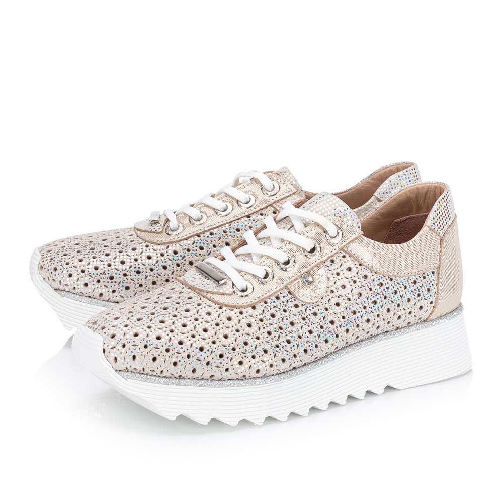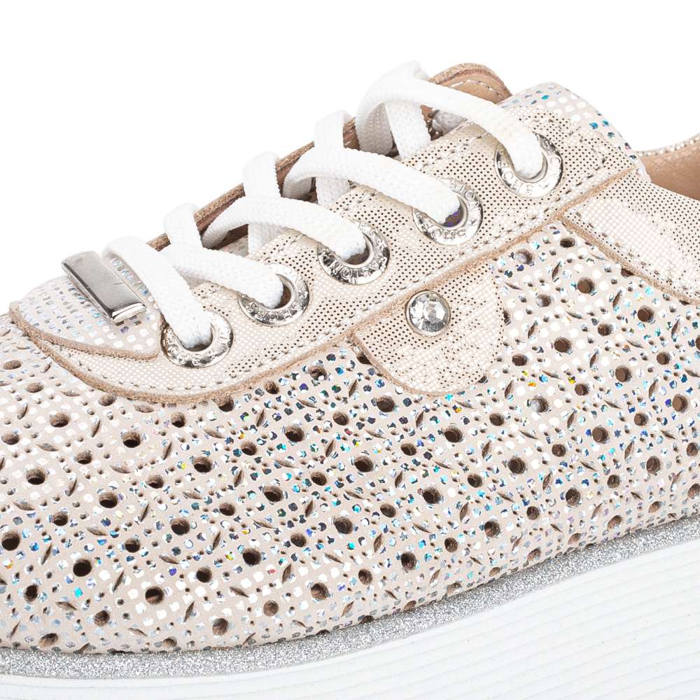 Rozjasněte své dny s těmito teniskami IBERIUS, které se pyšní nádhernými odlesky materiálu svršku a zdobnou perforací. Okouzlující vzhled je doplněný třpytivým kamínkem, který přidávají na eleganci. Kožený svršek i stélka poskytují maximální komfort při nošení, zatímco šněrování umožňuje snadné nazutí a dokonalé přizpůsobení tvaru chodidla. Stylový a zároveň pohodlný model, který podtrhne váš jedinečný vkus.