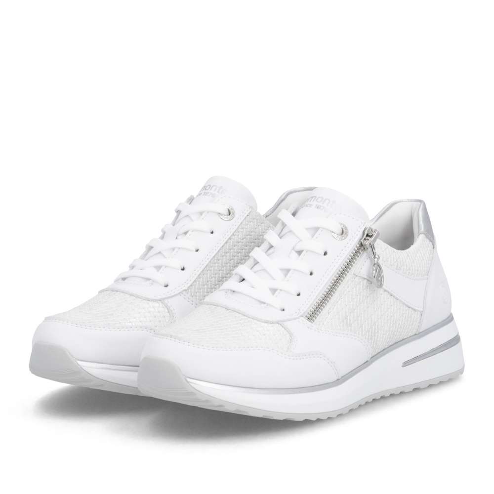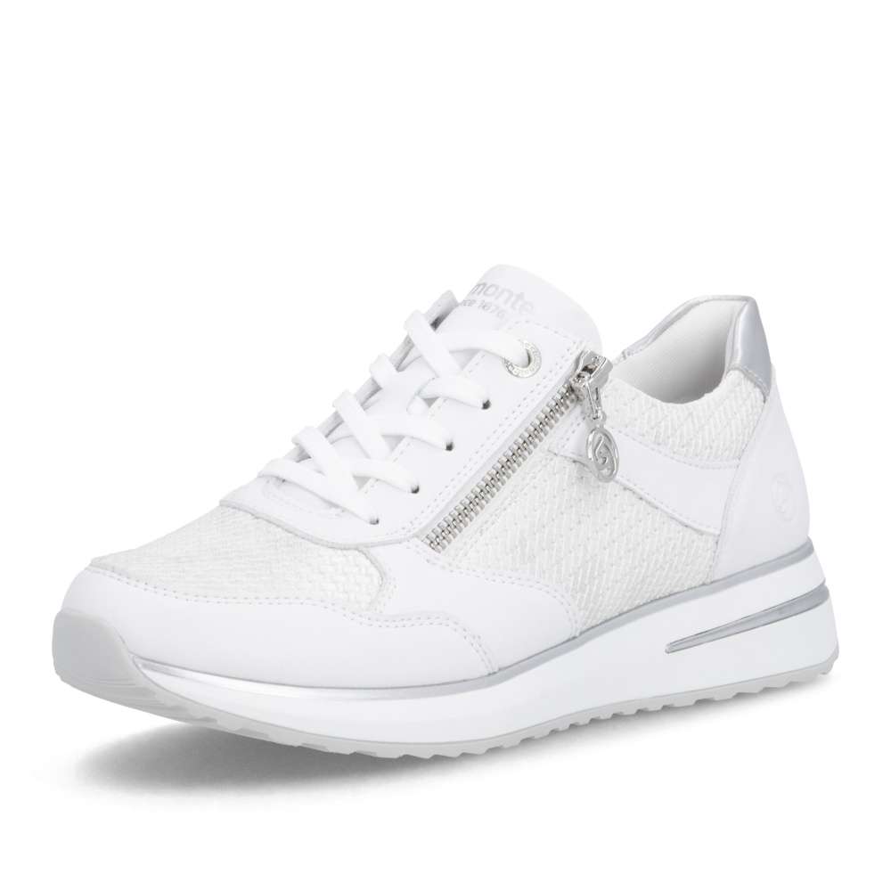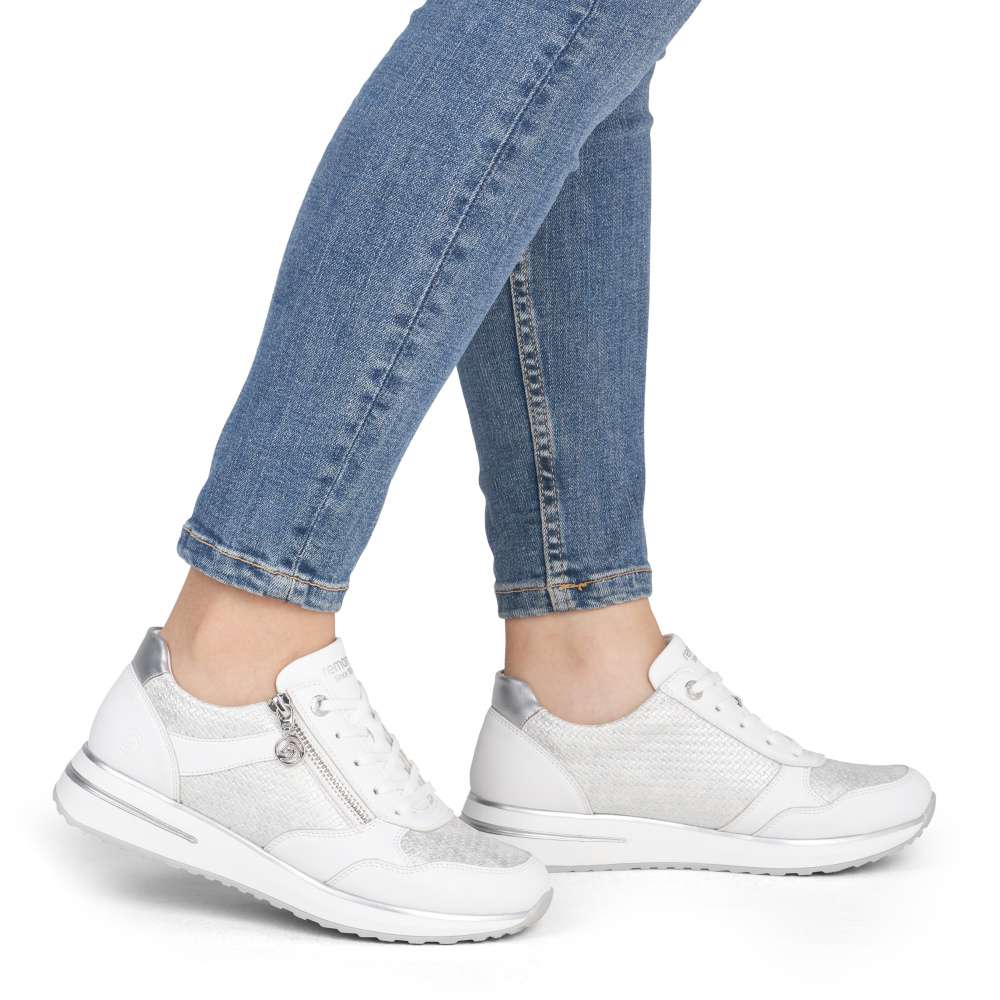 Obuv REMONTE představuje prémiovou řadu značky RIEKER, která se vyznačuje vysokou kvalitou použitých materiálů a precizním zpracováním. Tyto tenisky zaujmou nádhernou kombinací materiálových struktur bílého svršku, které přidávají modelu vizuální hloubku a jsou doplněny jemnými efekty odlesků. Takové propojení materiálů a barevných odstínů zajišťuje, že tenisky působí esteticky přitažlivě. Praktické detaily jsou promyšleně umístěny pro maximální komfort a funkčnost. Zip na nártu a klasické šněrování umožňují snadné obouvání a zároveň dokonalé přizpůsobení tvaru nohy. Vnitřní stélka je vyjímatelná, příjemně měkká a poskytuje pohodlí i při delším nošení. Flexibilní podešev se dokonale přizpůsobuje pohybu nohy, zajišťuje stabilitu a komfort na různých površích, čímž činí tyto tenisky ideálními pro každodenní nošení, procházky, volný čas i aktivní životní styl. Kombinace stylového designu, kvalitního zpracování a praktických funkcí z nich činí působivý doplněk, který spojuje estetiku s komfortem. Technologie: Remonte Soft – unikátní stélka vyrobená z prodyšného materiálu, která svým tvarem a materiálem zajistí pocit pohodlí při celodenním nošení. Lite'n Soft - maximální komfort při nošení vytváří kombinace lehké podešve, velmi příjemných materiálů a komfortní stélky. Tato bota je vybavena vyjímatelnou stélkou.