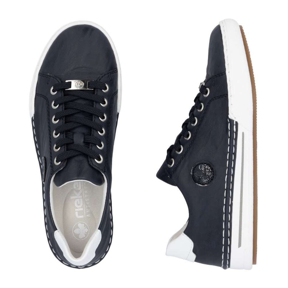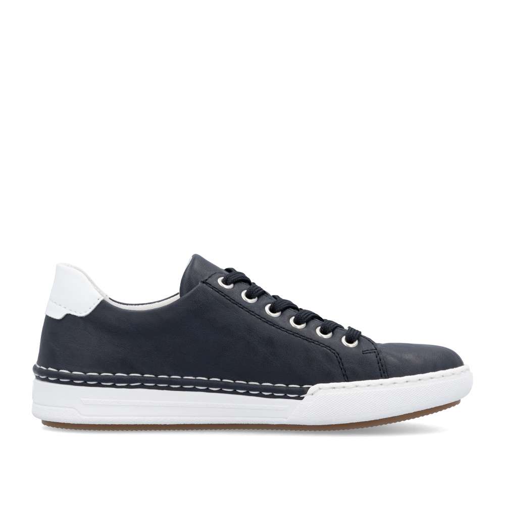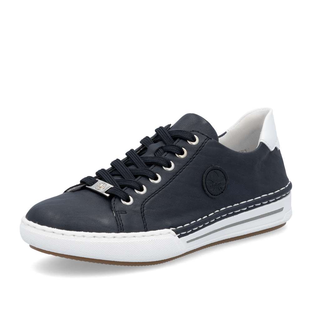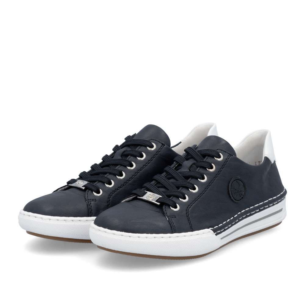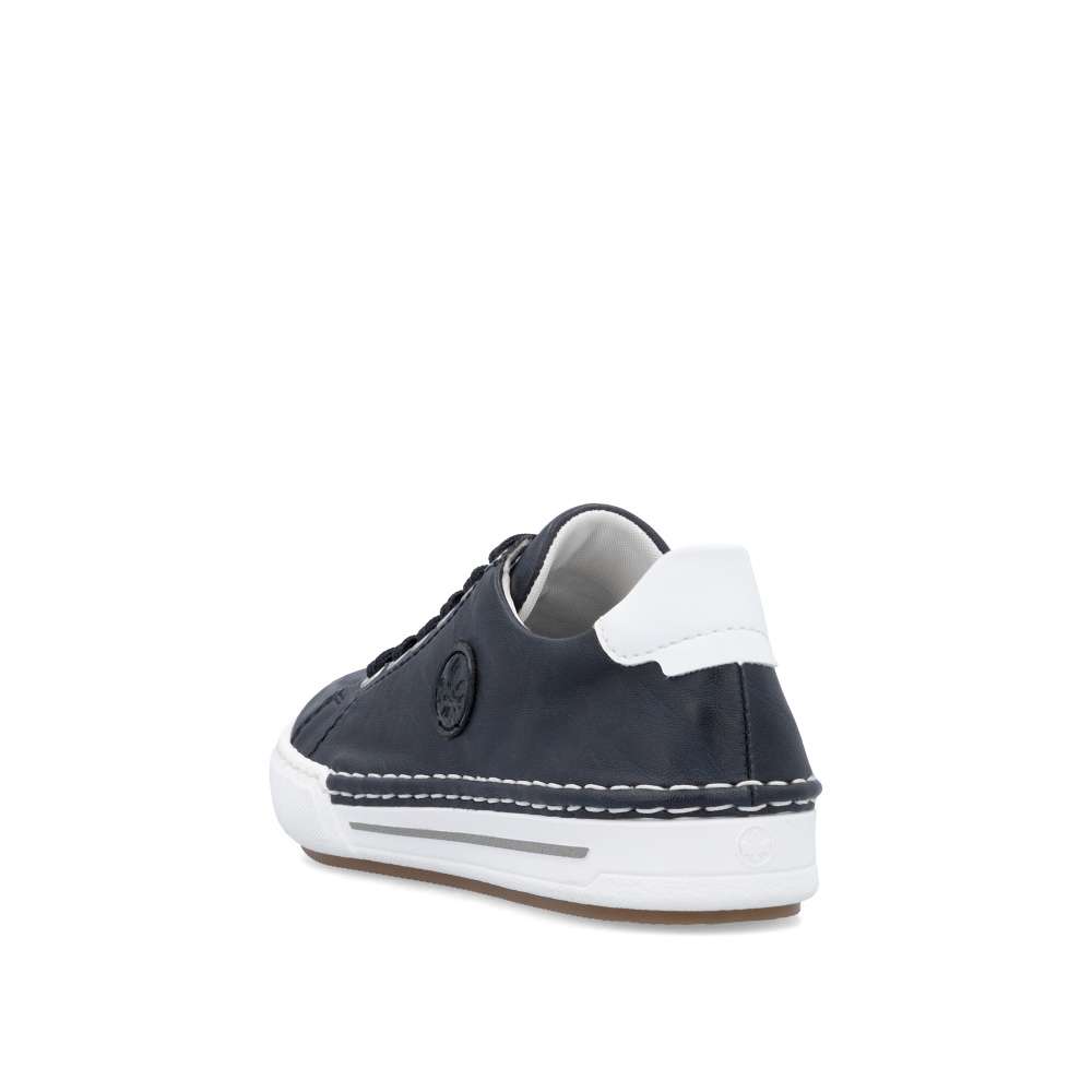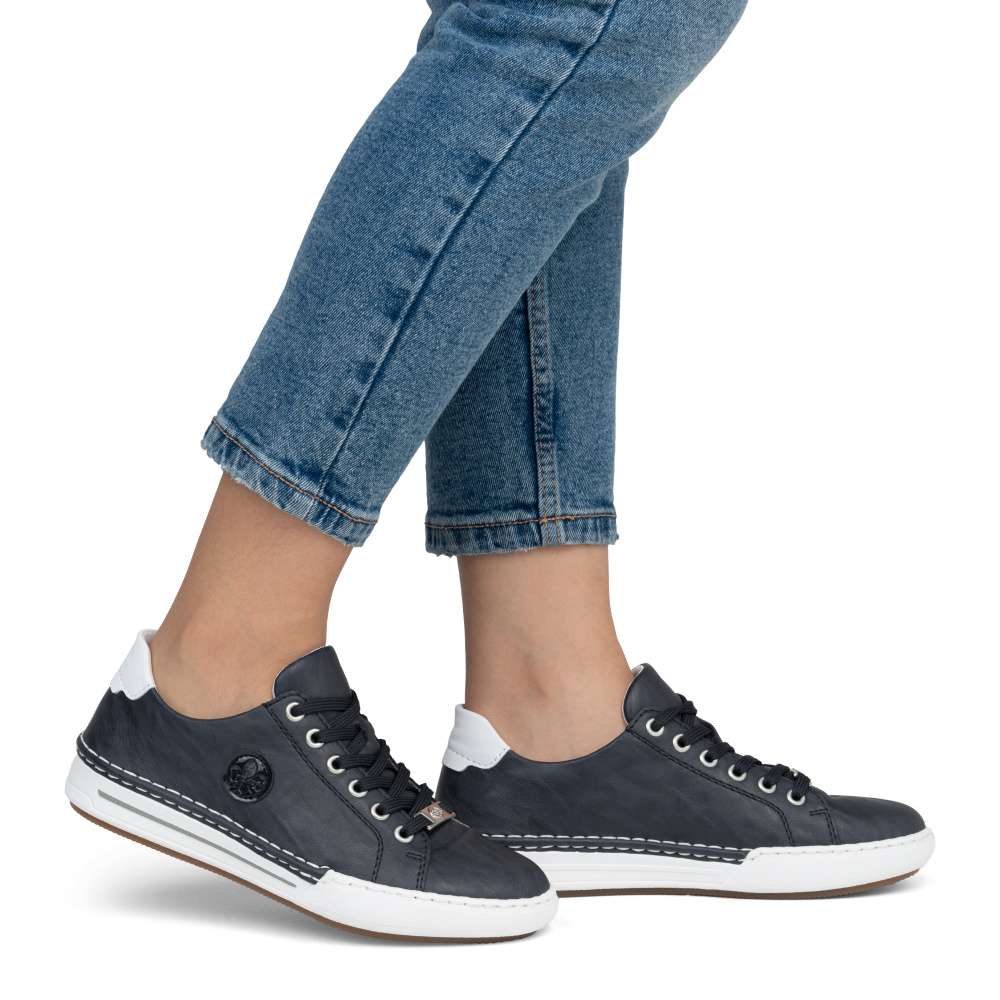 Detailní informace Tyto tenisky RIEKER obohatí Váš šatník o univerzální a kvalitní kousek, který Vás nikdy nezklame. Tmavě modrý svršek je dekorován logem značky a kontrastním prvkem bílé barvy v části paty. K obutí Vám poslouží šňůrky, kterými si boty můžete utáhnout podle Vašich představ tak, aby Vám dokonale seděly. O vaše pohodlí se postará měkká vyjímatelná stélka a podešev tlumící nárazy. Tyto tenisky jsou ideální volbou pro běžné pochůzky městem i do práce k ležérnímu oblečení.