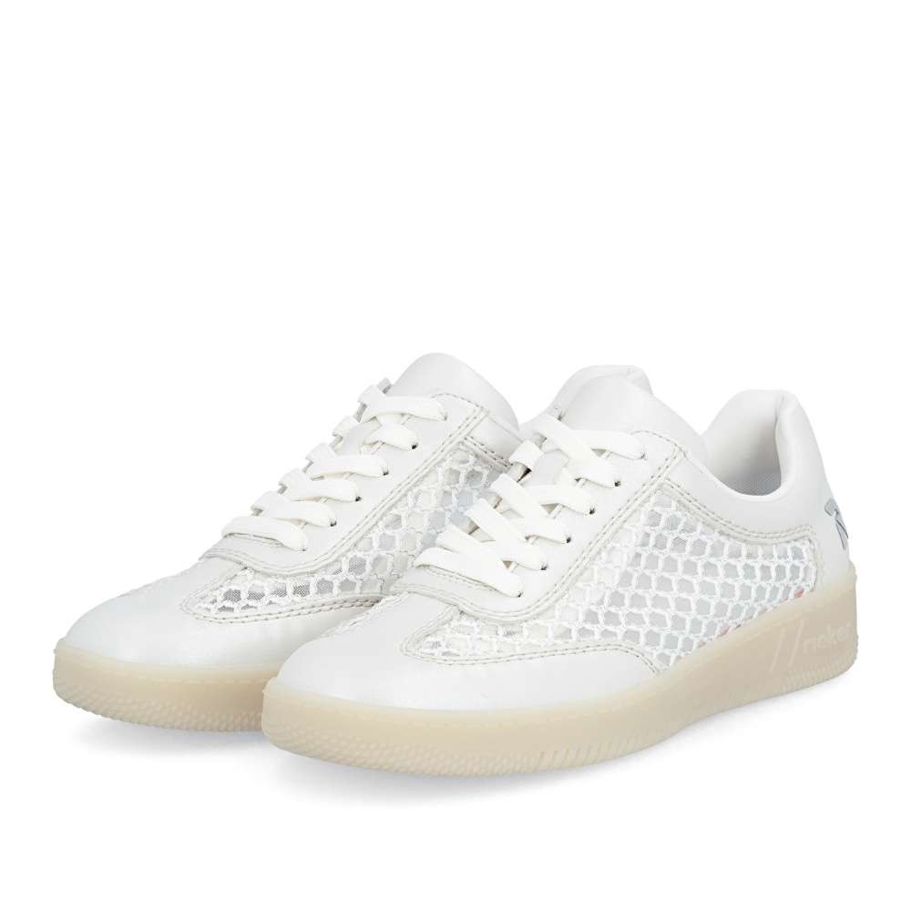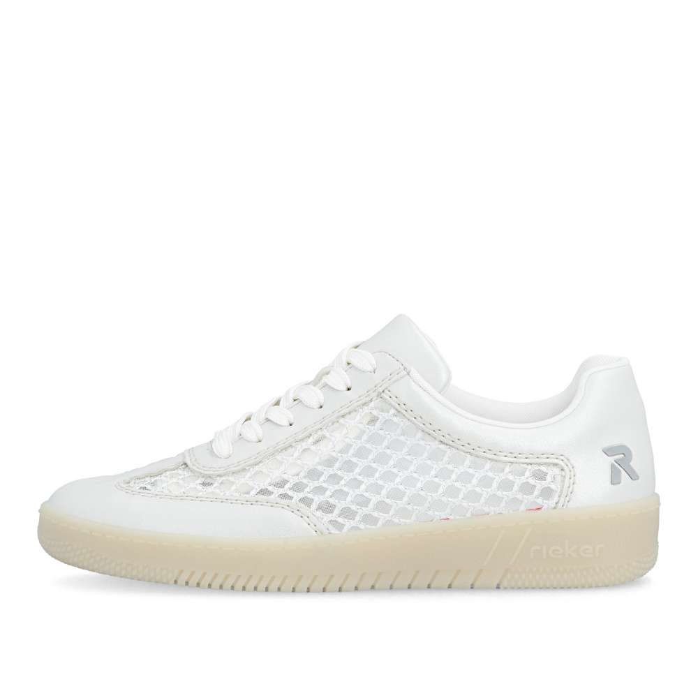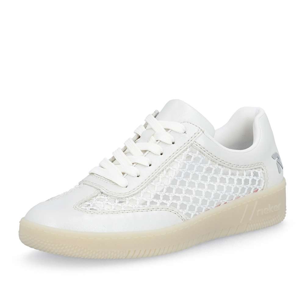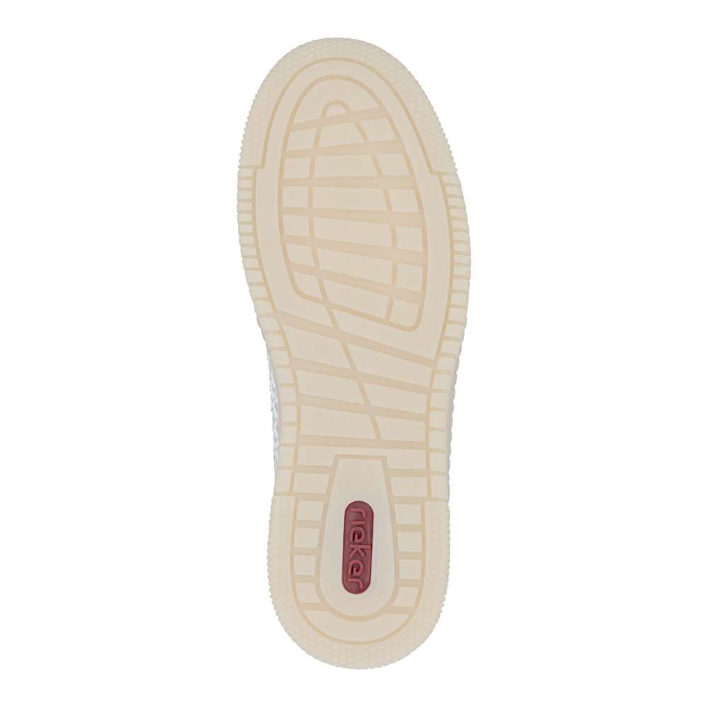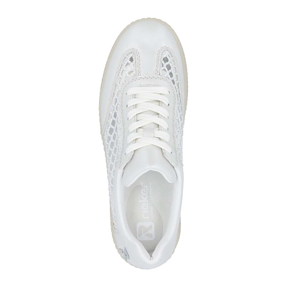 Detailní informace Stylová dámská teniska RIEKER nabízí moderní prodyšný design díky síťovaným bočním panelům a světlému třpytivému svršku. Obuv je vybavena vyjímatelnou soft stélkou, která poskytuje měkký došlap a možnost individuální úpravy podle vašich potřeb zajistí šněrování. Lehká a flexibilní podešev zajišťuje pohodlný krok po celý den a tím je tato obuv skvělou volbou pro každodenní nošení i volný čas.