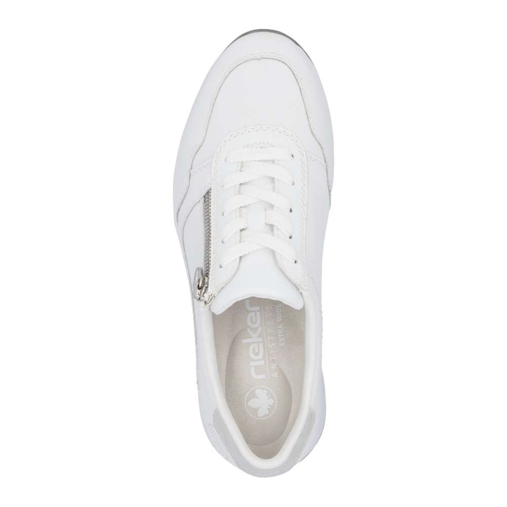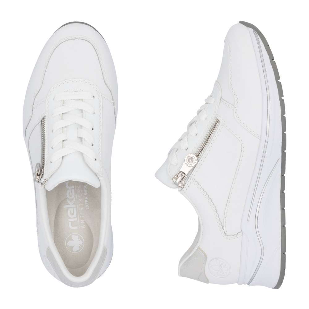 Tenisky RIEKER s jedinečným stylem a maximálním pohodlím, které vám nabídnou skvělý zážitek při každém kroku. Bílý svršek je doplněn jemnými aplikacemi s odlesky pro vytvoření módního vzhledu. Díky promyšlenému designu a kvalitním materiálům se stanou ideální volbou pro každodenní nošení. S nártovým šněrováním a zipem nabízejí tyto tenisky nejen výrazný vizuální dojem, ale také praktický způsob obouvání. Maximální pohodlí zajistí měkká vyjímatelná stélka, která vytváří podporu během každého kroku. Podešev tenisek efektivně tlumí nárazy při chůzi a svým propracovaným designem vytváří také stylový vzhled. Tento model obuvi bude vkusným doplňkem každého dne, kdy chcete spojit pohodlí a styl. Technologie: Antistress – díky čtyřem antistresovým vlastnostem – lehkosti, pružnosti, prostornosti a vynikající absorpci nárazů – vám boty RIEKER nabídnou komfortnější chůzi. Rieker Soft – unikátní stélka vyrobená z prodyšného materiálu, která svým tvarem a materiálem zajistí pocit pohodlí při celodenním nošení. EXTRA WIDE – boty jsou širšího střihu, tvar boty je přizpůsoben chodidlu pro vytvoření dostatečného prostoru v oblasti přední části chodidla. Tato bota je vybavena vyjímatelnou stélkou.