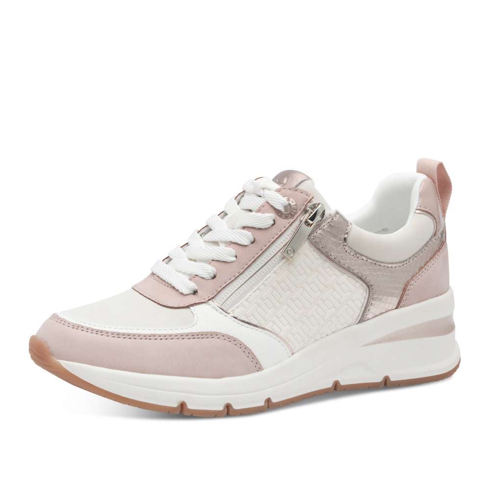 Detailní informace Tyto dámské tenisky od značky Tamaris jsou kombinací módního designu a komfortu. Svršek tenisek je precizně poskládaný z více částí, co dodává obuvi originální vzhled, a navíc jsou zdobeny kovovými odlesky, které přidávají jiskru a eleganci. Zip na nártu usnadňuje nazutí, a kromě toho mají klasické šněrování, které umožňuje přesně nastavit šířku pro optimální pohodlí během nošení. Vyšší podrážka tenisek nejenom dodává obuvi stylový vzhled, ale také zvyšuje stabilitu a pohodlí při chůzi. Vyjímatelná stélka uvnitř tenisek poskytuje možnost přizpůsobit obuvi podle svých potřeb a usnadňuje čištění a údržbu. Tyto tenisky Tamaris s třpytivými odlesky jsou ideální volbou pro ženy, které hledají stylovou a pohodlnou obuv s nápadným designem.