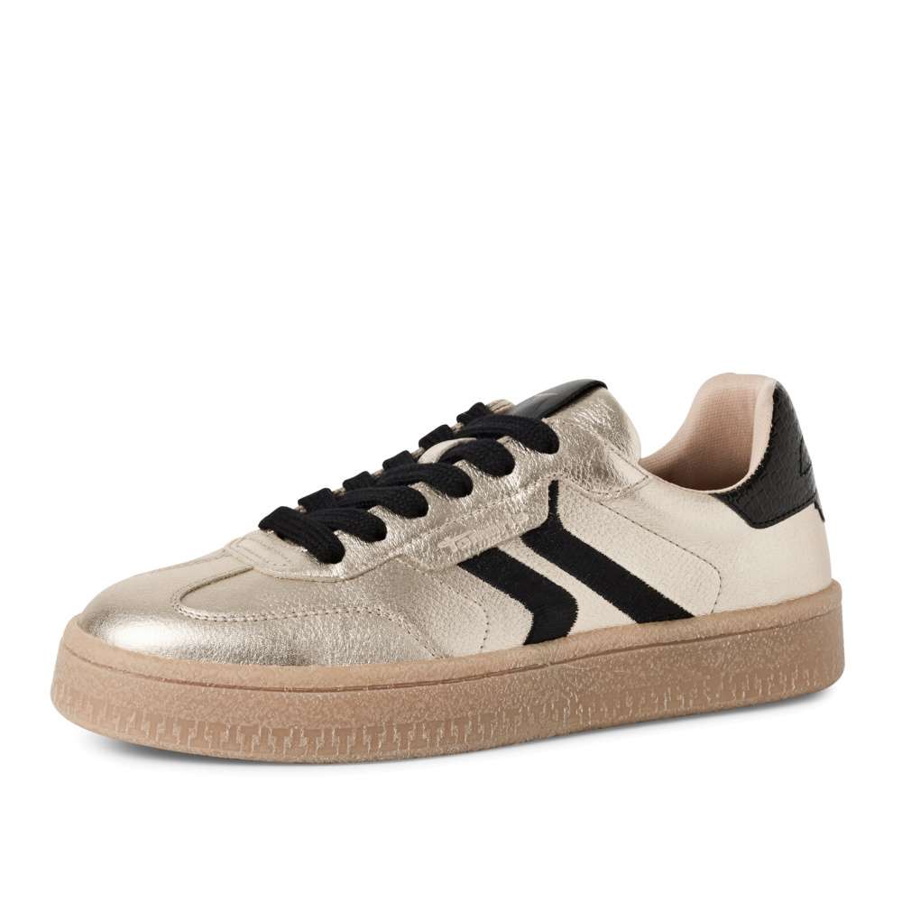Značka Tamaris přináší tento stylový kousek, který zvýrazní vaši originalitu a dodá vašim krokům sebevědomý a moderní nádech. Okouzlující zlaté odlesky materiálu svršku dekorují černé aplikace, které zvýrazní originalitu tohoto modelu. Praktické šněrování zajistí optimální přizpůsobení individuálním potřebám každé z Vás, vyšší stabilní podešev podpoří jistý krok a měkká vyjímatelná stélka se dokonale přizpůsobí tvaru chodidla. Tyto tenisky spojují moderní vzhled s maximálním pohodlím, díky čemuž jsou ideální volbou pro každý den, kdy chcete vypadat stylově a zároveň se cítit pohodlně. Technologie: Touch-it – měkká stélka, která se dokonale přizpůsobí tvaru nohy, a díky tomu při nošení zajišťuje optimální pohodlí. Tato bota je vybavena vyjímatelnou stélkou.