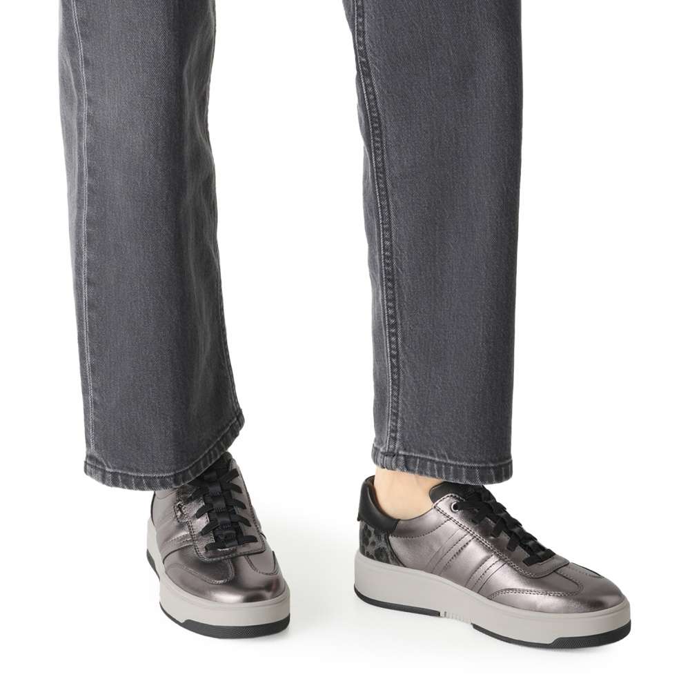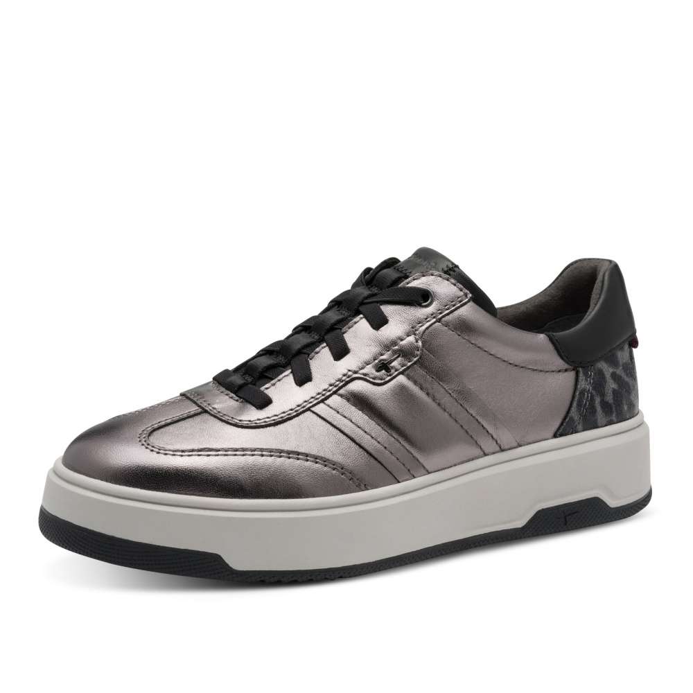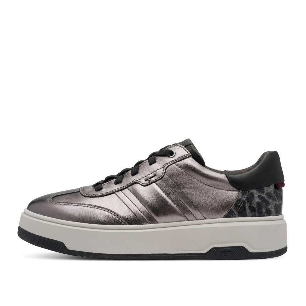 Detailní informace Tyto tenisky Tamaris v moderním stříbrném provedení zaujmou na první pohled a dodají vašemu outfitu osobitý styl. Svršek s působivými odlesky je doplněn kontrastní černou částí a částí s atraktivním zvířecím vzorem v patní oblasti, tento detail podtrhuje jejich trendy vzhled a činí je originálním kouskem pro každodenní nošení. Šněrování slouží jako praktický prvek pro přesné přizpůsobení noze a vytvoření dokonalého pohodlí při nošení. Po nazutí si budete užívat komfort kožené vyjímatelné stélky, která navíc umožňuje snadnou údržbu nebo výměnu podle potřeby. Pomyslnou komfortní tečkou je vyšší podešev poskytující stabilitu a podporu při každém kroku. Výrazný design těchto tenisek z nich dělá stylový doplněk, který podtrhne váš vzhled v každé situaci. Ať už míříte do práce, na procházku nebo setkání s přáteli, budete v nich působit sebevědomě. Díky poskytovanému pohodlí si můžete naplno užít každý krok bez kompromisů mezi stylem a komfortem.