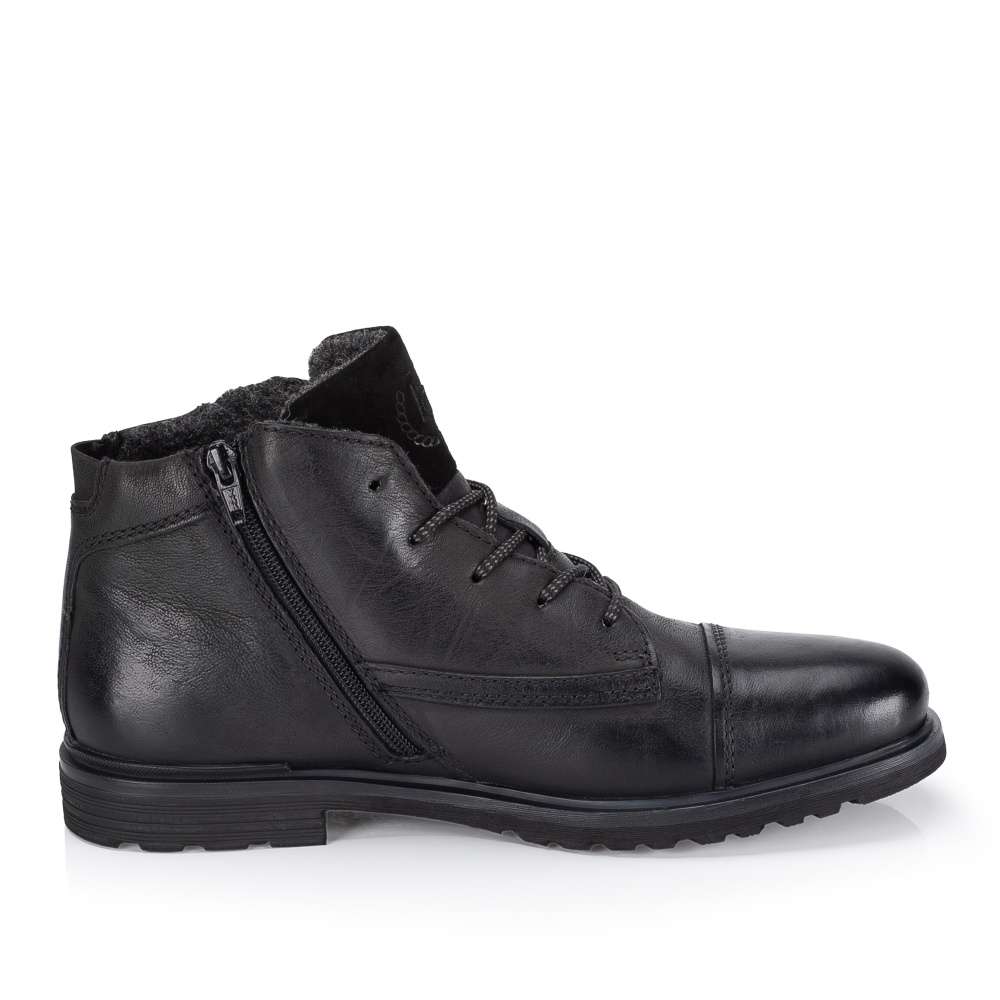 Pánské kotníkové boty značky BUGATTI jsou ideálním spojením moderního designu, kvalitního zpracování a maximálního pohodlí při nošení. Už na první pohled zaujmou svrškem z přírodní usně černé barvy, která je nejen univerzální, ale zároveň dodává botám nadčasový charakter. Hladký povrch s prošíváním působí velmi stylově, přičemž detail v oblasti kotníku s aplikací zipu a logem značky podtrhují jejich jedinečný vzhled. K praktickým prvkům patří zejména zip na vnitřní straně, který umožňuje rychlé a pohodlné obutí bez zbytečné námahy. Klasické šněrování pak zajišťuje optimální přizpůsobení obuvi přímo vašemu chodidlu, takže se můžete spolehnout na perfektní padnutí v každé situaci. Vnitřní část boty je navržena s důrazem na komfort – příjemná textilní podšívka a měkká stélka se postarají o pohodlí i během celodenního nošení. Stabilní podešev je zárukou jistého kroku a dodává modelu sportovně-elegantní šmrnc, díky kterému tyto boty snadno sladíte jak s džínami, tak i s chinos kalhotami či volnočasovým sakem. Tyto kotníkové boty BUGATTI jsou skvělou volbou pro každodenní nošení, pracovní schůzky i volný čas.