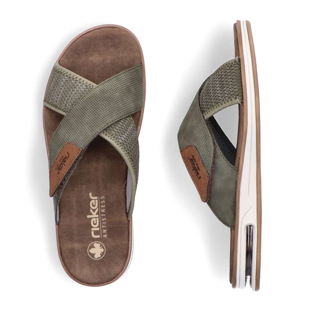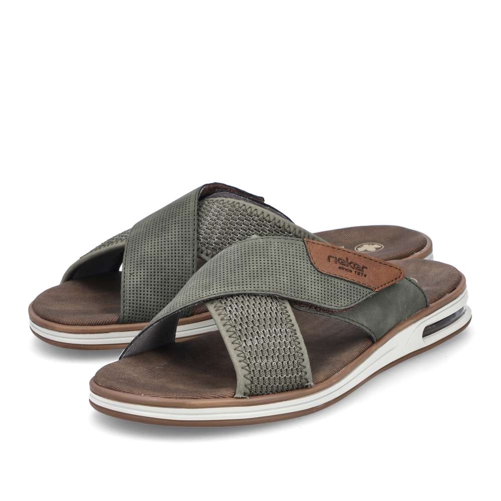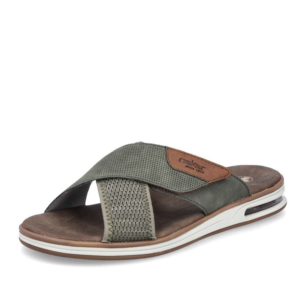 Zažijte letní pohodlí se stylovým vzhledem s pánskými nazouváky značky RIEKER! Zelený svršek se zajímavou kombinací materiálů, kterou dekoruje nášivka s logem značky, je vytvořen dokonalý módní vzhled. Pásek přes nárt je opatřen praktickým suchým zipem, což umožňuje dokonalé přizpůsobení potřebám vaší nohy. Jako příjemný bonus je podešev obohacena technologií tlumící nárazy pro zajištění maximálního komfortu při každém kroku. Vychutnejte si léto ve stylu a pohodlí. Technologie: Antistress – díky čtyřem antistresovým vlastnostem – lehkosti, pružnosti, prostornosti a vynikající absorpci nárazů – vám boty RIEKER nabídnou komfortnější chůzi.