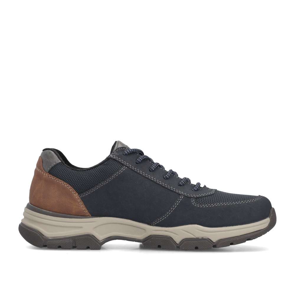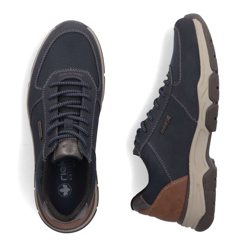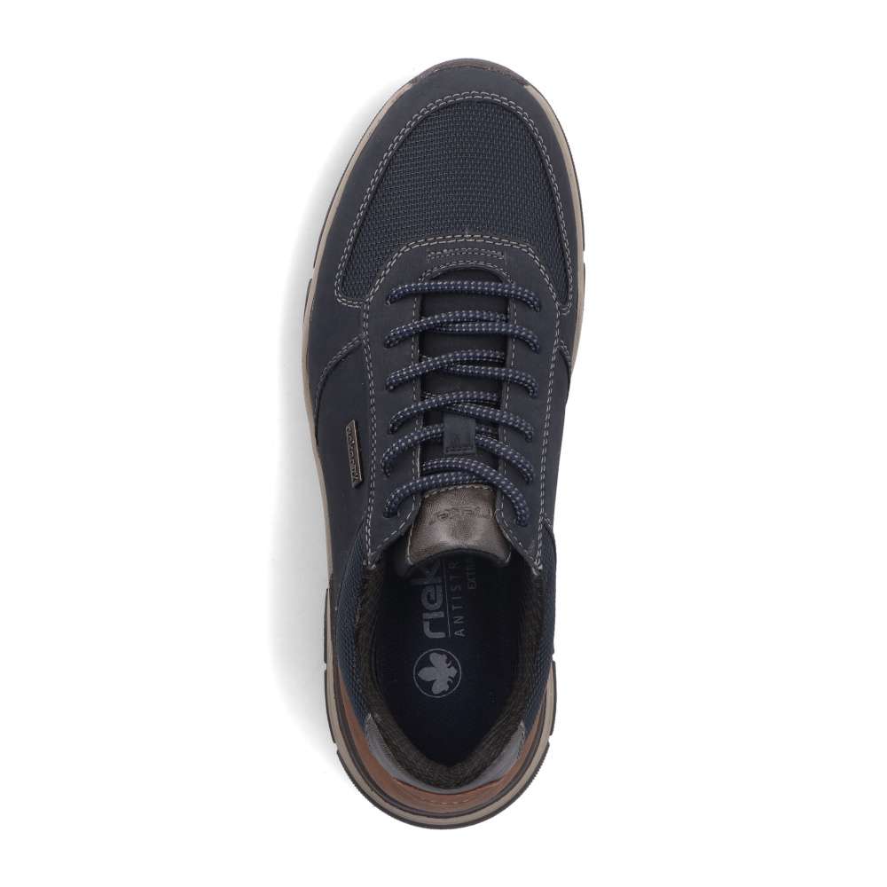 Tyto pánské boty jsou ideální volbou pro muže, kteří chtějí kombinovat styl s praktičností. Zajímavá kombinace materiálů svršku v modrých tónech a kontrastně hnědou aplikací v části paty je obohacena o nepromokavou vrstvu pro zajištění komfortu i v nepříznivém počasí. Šněrování zajistí, že Vám boty skvěle padnou a díky vyjímatelné stélce širšího střihu Vám bude pohodlně po celý den nošení. Designová podešev nejen výborně tlumí nárazy, ale také dodává botám moderní vzhled a zajistí stabilitu každým krokem. S moderním designem těchto bot a praktickými vlastnostmi budou dokonalým obutím každého dne. Technologie: Antistress – podešev je díky této technologii lehká, flexibilní, absorbuje nárazy při došlapu a snadno se přizpůsobí každé noze. Rieker TEX – funkční vrstva, díky které je svršek boty nepromokavý a přesto prodyšný. Tato bota je vybavena vyjímatelnou stélkou. EXTRA WIDE – boty jsou širšího střihu, tvar boty je přizpůsoben chodidlu pro vytvoření dostatečného prostoru v oblasti přední části chodidla.
